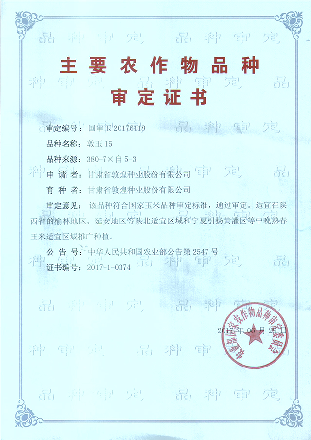 敦玉15品種審定證書(國家)